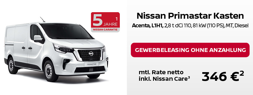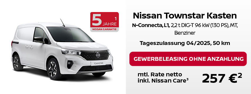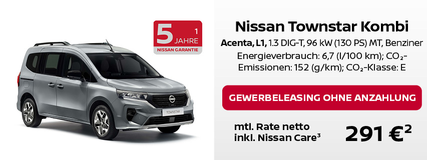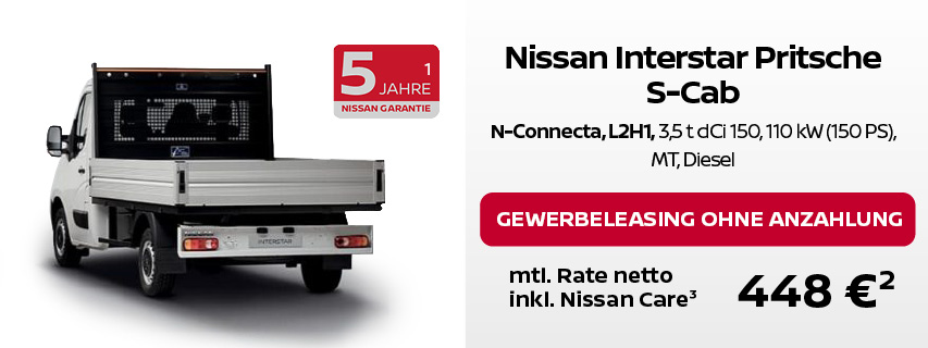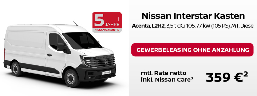 ² Leasing über NISSAN Bank, Geschäftsbereich der RCI Banque S.A. Niederlassung Deutschland, Jagenbergstraße 1, 41468 Neuss für Gewerbekunden: NISSAN TOWNSTAR KOMBI, Acenta: 0 € Leasingsonderzahlung, Laufzeit 48 Monate, Gesamtfahrleistung 10.000 km p.a. NISSAN TOWNSTAR KASTEN, N-Connecta: 0 € Leasingsonderzahlung, Laufzeit 60 Monate, Gesamtfahrleistung 10.000 km p.a. NISSAN PRIMASTAR KASTEN, Acenta: 0 € Leasingsonderzahlung, Laufzeit 60 Monate, Gesamtfahrleistung 10.000 km p.a. NISSAN INTERSTAR KASTEN, Acenta: 0 € Leasingsonderzahlung, Laufzeit 60 Monate, Gesamtfahrleistung 10.000 km p.a. NISSAN INTERSTAR PRITSCHE SCab, N-Connecta: 0 € Leasingsonderzahlung, Laufzeit 60 Monate, Gesamtfahrleistung 10.000 km p.a.